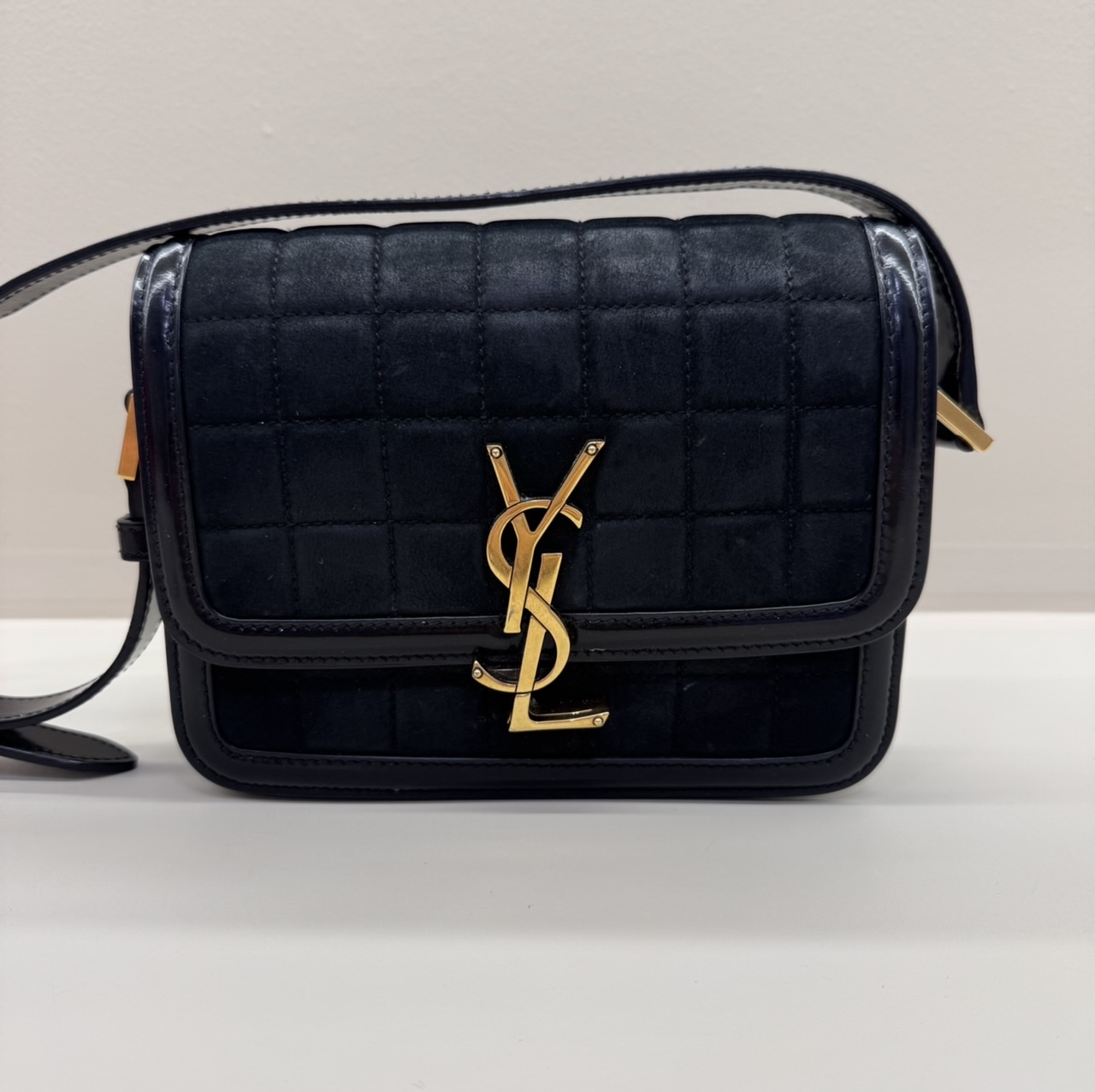Seu acabamento em suede preto confere textura refinada, enquanto a alça ajustável e o fecho com o monograma YSL entregam versatilidade e sofisticação.